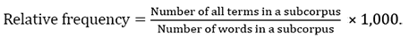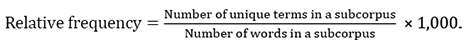 The quantitative analysis of the data has revealed that the annotated corpus contains 8,813 annotated cybersecurity terms out of which 2,579 terms are unique. As the genre-specific subcorpora differ in size, the relative frequencies of terms per 1,000 words have been calculated to compare the density and diversity of terminology in the subcorpora. The following formulae have been used for the calculations (cf. Biber et al., 2002):