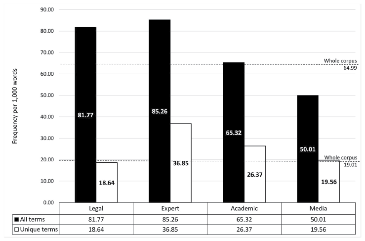 The density of CS terms is the highest in the expert and legal texts, while the second position according to this measure is taken by the academic texts. Meanwhile, the media texts have the lowest density of all genres. The density counts confirm the overall tendencies of terminology usage: popular discourse texts (media texts), the addressee of which is the general public, are terminologically less dense than specialised discourse texts, which are much more specialized and targeted mostly at experts and professionals.