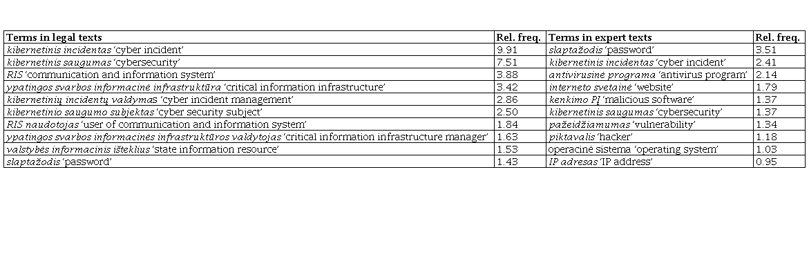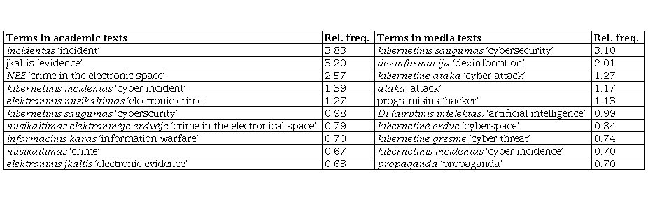 Only two terms occur in the TOP 10 lists of all subcorpora: kibernetinis saugumas (‘cybersecurity’), kibernetinis incidentas (‘cybersecurity incident’). In addition, slaptažodis (‘password’) occurs in the lists of two subcorpora: the expert texts and the legal texts. However, the relative frequencies of these terms are very different: frequencies of kibernetinis saugumas vary from 7.51 in the legal texts to 0.98 in the academic texts; frequencies of kibernetinis incidentas vary from 9.91 in the legal texts to 0.70 in the media texts; frequencies of slaptažodis are 3.51 in the expert texts and 1.43 in the legal texts. Moreover, the synonymous terms denoting a hacker are used in the expert and media texts: piktavalis and programišius. Their frequencies are similar: 1.18 and 1.13 respectively. Other terms are non-repetitive and not synonymous across the genres. Their frequency depends on the dominating topics in each subcorpus.