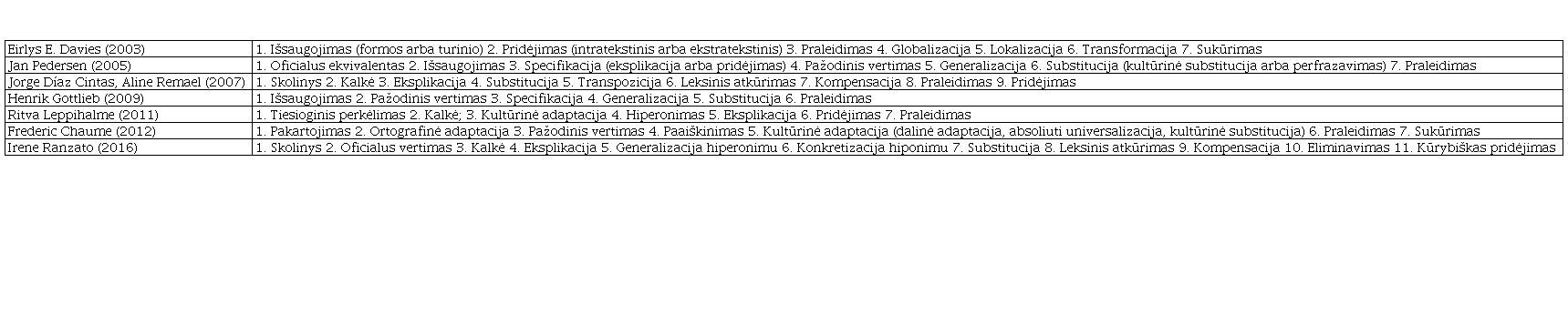 Iš 2-os lentelės matyti, kad skirtingi autoriai įvardija tokias pačias procedūras (pvz., išsaugojimas, praleidimas, substitucija, pažodinis vertimas), tokiam pačiam vertimo būdui įvardyti pasitelkia skirtingus terminus (pvz., praleidimą ir eliminavimą) arba tą patį terminą vartoja skirtingoms vertimo procedūroms įvardyti (pvz., E. E. Davies pridėjimu žymi KRP išplėstinį paaiškinimą, o I. Ranzato kūrybišku pridėjimu – papildomo KRP įtraukimą į vertimo tekstą).