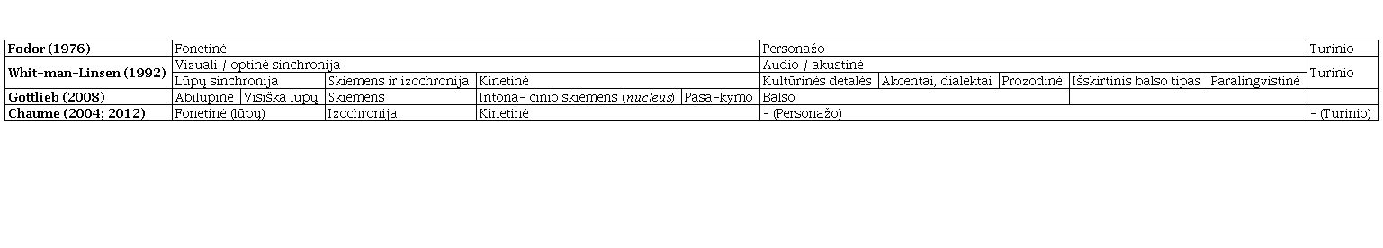 F. Chaume visuose savo darbuose (pvz., 2004, p. 44; 2012, p. 69; 2020, p. 103) mini ir I. Fodoro išskirtas personažo bei turinio sinchronijas, tačiau visada pabrėžia, kad jų nelaiko „tikrais“ sinchronijos tipais. Jo manymu, vertimo teksto dermė su kitais kodais, pvz., vaizdais ir muzika, yra ne turinio sinchronija (kaip apibrėžia Mayoral ir kt., 1988, p. 359), o koherencija. O personažo sinchronijai vertėjas ar adaptuotojas įtakos neturi, nes šis aspektas labiau susijęs su dubliažo režisieriaus ir aktorių darbu (Chaume, 2012, p. 70). Vis dėlto dubliuoto kūrinio kokybei personažo sinchronija, t. y. veikėjo išvaizdos, balso ir sakomų žodžių dermė ne mažiau reikšminga už kitus sinchronijos tipus. Ją išsamiai tiria ir Ch. Bosseaux (2015), išskirdama balso aukštį, garsumą ir tempą. Manytina, kad personažo sinchronija aktuali ir KRP vertimui dubliuotuose filmuose: tikslinei kultūrai nebūdinga personažo išvaizda ir balso ypatybės galėtų paskatinti pasirinkti labiau svetinančias vertimo procedūras.