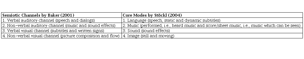 Hartmut Stöckl, in a similar manner, introduces four core modes or abstract types of semiotic resources: sound, music, image and language, claiming that the visual and auditory semiotic resources required to create and interpret audiovisual texts can be grouped under them (Stöckl, 2004, pp. 11–15). Sound and music can be realized through auditory and visual media and usually go accompanied by or in synchrony with the images. Although the music is usually heard in films; in some cases, it can also be seen when, for example, printed score or sheet music is presented in the visual texture of a film when it is relevant to the plot. The same is with the image and language that can also be instantiated in several medial variants, for example, pictures can be moving, which is essential to the make-up of audiovisual texts, or in some cases, directors can choose to use “freeze-frames” (Stöckl, 2004, p. 13), meanwhile, language can be expressed through static writing, i.e., subtitles that are used to translate dialogue into another language, or dynamic writing, though not to translate a film but to interact with a film (Stöckl, 2004, pp. 11–15)3.