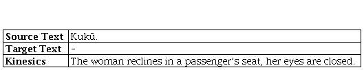 To begin with, the following case witnesses the importance of cohesive interrelations between audio and visual channels. The woman and the man are sitting in the car. It is an early morning, the woman is waking up from a nap: she is reclining in the passenger’s seat with her eyes closed and pronounces kukū which is an onomatopoeic phrase imitating the sound made by a bird cuckoo: