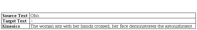 Having grasped her friend’s intentions, the woman is surprised and astonished. In the source text, she utters oho, which is a Lithuanian interjection, to express amazement. In the target text, the blank line appears in subtitles and the expression remains untranslated.