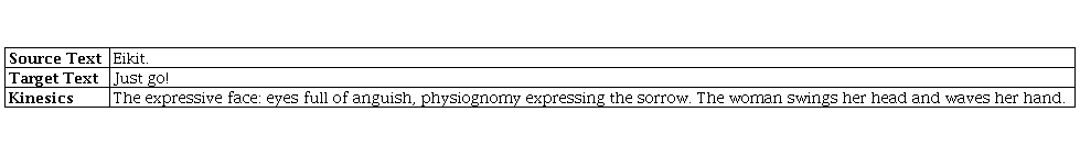 When the nurse asks the old lady – to have a meal, the lady swings her head and waves her hand aside, demonstrating that she wants to be left alone. Moreover, the woman’s face is also very expressive: her eyes are full of anguish, and her physiognomy clearly expresses her sorrow. The old lady’s body gestures are accompanied by a very silent and almost inaudible verbal utterance Eikit. (En. Go.) which is translated into Just go! The utterance is accompanied by an intonation that conveys helplessness and sadness. The translator chooses to end this phrase with an exclamation mark which demonstrates the imperative. However, although a command is not strict and as the paralanguage, i.e., the pitch and the intonation of her voice, as well as conspicuous kinesics, illustrate, it is rather a plea to let her enjoy the moment and recall and recollect her old times in solitude.