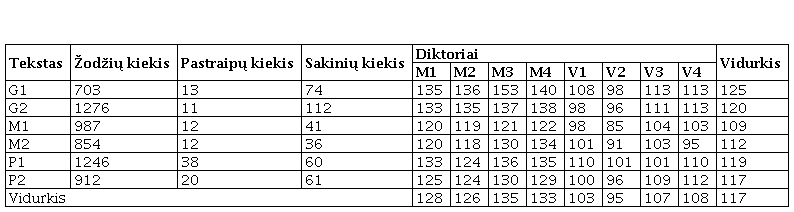 Skaitymo greitis nustatytas kiekvieno teksto žodžių kiekį padalinus iš garso įrašo trukmės. Iš 1 lentelėje pateiktų duomenų matyti, kad vidutinis diktorių skaitymo greitis – 117 žodžių per minutę.