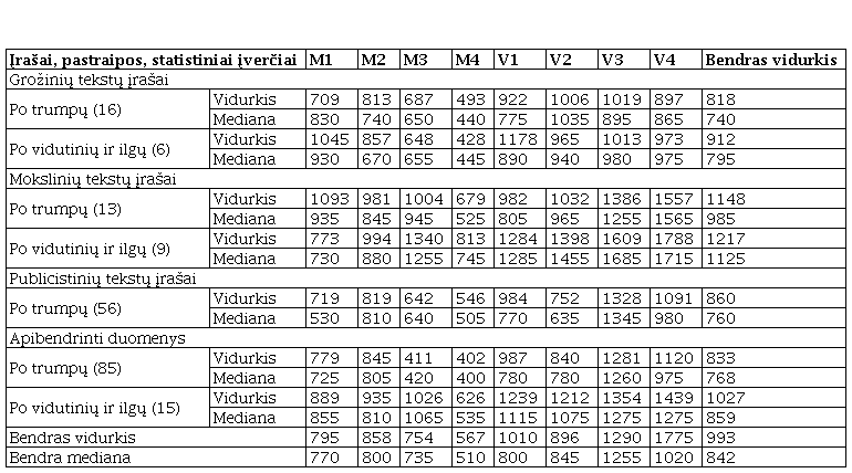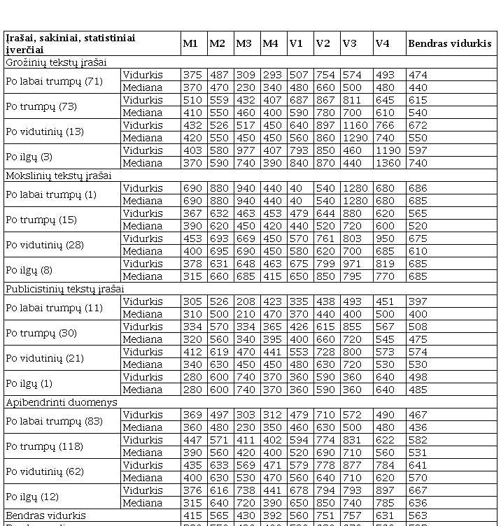 Remiantis užsienio mokslininkų tyrimais ir darbo su įgarsintais tekstais patirtimi (ne tik šio tyrimo metu), vidutinio ilgio pastraipomis laikytos tos pastraipos, kurios, rašant Times New Roman 12 pt šriftu, užima 7–11 eilučių (Alley 1996) arba yra sudarytos iš maždaug 150 žodžių (Connely, Forsyth 2011). Peržvelgus lietuviškus tekstus, paaiškėjo, kad į septynias eilutes telpa maždaug 90–100 žodžių, į 11 – apie 150–160 žodžių, todėl 90–160 žodžių pastraipos toliau laikomos vidutinėmis, mažiau žodžių turinčios – trumpomis, daugiau – ilgomis. Trumpų pastraipų tiriamuosiuose tekstuose rasta daugiausia – 85 proc. (publicistiniai tekstai buvo sudaryti tik iš trumpų pastraipų), vidutinių – 11 proc., ilgų – 4 proc. Dėl nedidelio vidutinių ir ilgų pastraipų kiekio jos nagrinėjamos ir aptariamos kartu.