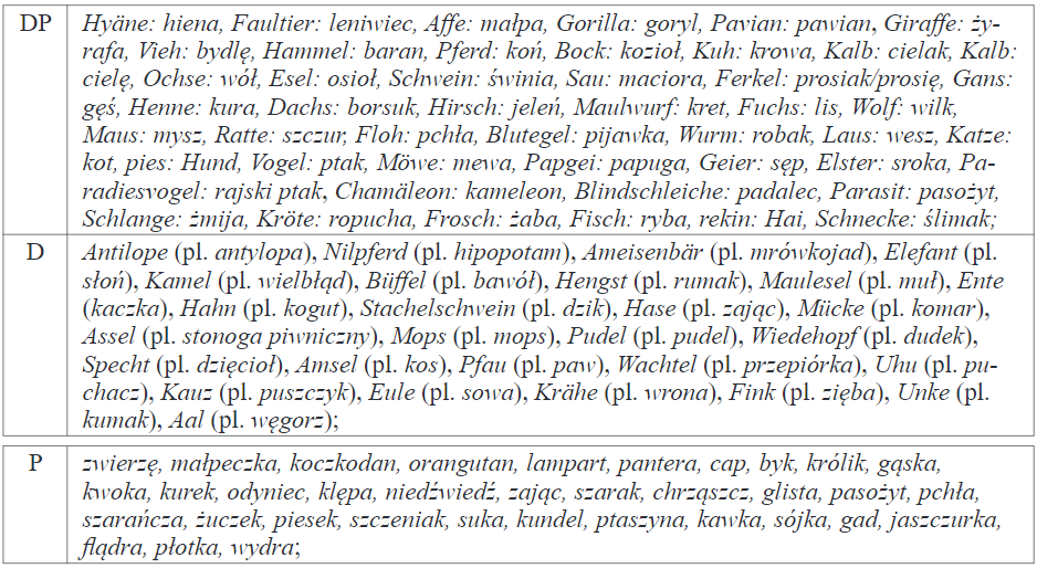 W oparciu o sformułowane powyżej założenia badawcze można wskazać na to, że mimo stałej obecności niektórych zwierząt w życiu przedstawicieli obu kultur językowych, nie wszystkie zwierzęta, ich cechy wyglądu, sposoby zachowania się i inne właściwości osobnicze stanowią źródło motywacji dla wyzwisk osobowych w obu kulturach. W poniższej tabeli zestawiam określenia zwierząt, które funkcjonują jako osobowe wyzwiska lub ich komponenty w obu kulturach językowych (DP), tylko w języku niemieckim (D) oraz tylko w języku polskim (P).