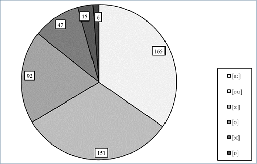 The material for this study comprises 476 cases of stressed English vowels and diphthongs from the fourth viseme of rounded and protruded sounds, which together with other phonemes constitute 1 hour 35-minute long film. There were identified precisely 165 cases of [u:], 151 – [oʊ], 92 – [ɔː], 47 – [ʊ], 15 – [ɔɪ] and 6 – [ɒ] (the findings are shown in Figure 1). The calculated percentage of the overall results is as follows: 35% of [u:], 32% of [oʊ], 19% of [ɔː], 10% of [ʊ], 3% of [ɔɪ] and 1% of [ɒ].
