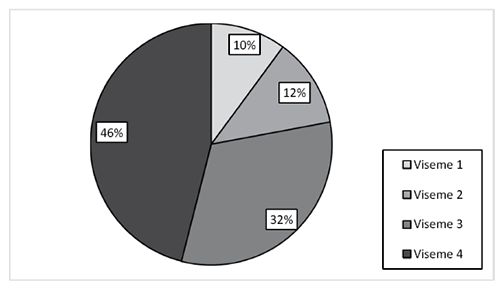 According to Table 3, a diagram (Figure 2) was created to give a more precise presentation of the percentage of each employed viseme. The first and second visemes were used only in 10% and 12% of all the cases. The most commonly used viseme for translation of ST rounded and protruded phonemes was the fourth one (46%); however, there was also a considerable number of the usage of the third viseme (32%).