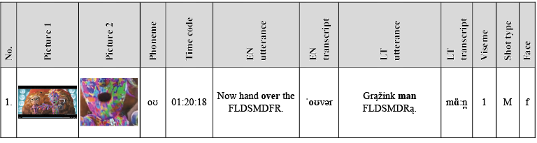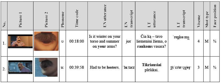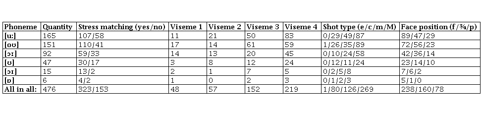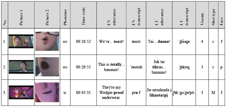 Articulatory features of phonemes allow to classify them into visemes. Rounded and protruded vowels and diphthongs belong to the fourth viseme: LT (in IPA symbols) – [ʊ], [u:], [ʊ̂ɔ], [ʊɔ], [ʊ̂ɪ̯], [ʊɪ̯̂], [eǔ̯ˑ], [ɐǔ̯ˑ], [ɔ], [o:], [ɔ̂ɪ̯], [ɔ̂ʊ̯], EN – [ʊ], [u:], [ʊə], [əʊ], [ɒ], [ɔː], [ɔɪ], [oʊ] (the latter is included by the authors of this paper, considering the fact that in American English (in which film characters speak) [əʊ] is usually replaced by [oʊ]).