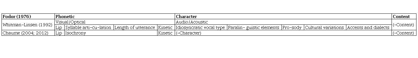 Audiovisual translation scholars suggest different typologies of synchronies. As seen in the table below, lip synchrony falls under the title of phonetic synchrony as an umbrella term in Fodor’s typology along with Chaume’s isochrony and kinetic synchrony and Linsen’s even more detailed syllable articulation, length of utterance and kinetic synchrony. Fodor was not only the first to name the types of synchronies, but he also developed visual phonetics as a separate area of study which analyses “the mouth articulatory movements of the screen actor and the phonemes that the translator should fit his or her mouth” (Chaume, 2004, p. 38). These studies are important as they seek to find a way to make the translation fit the original image and preserve the feeling of reality for the audience.