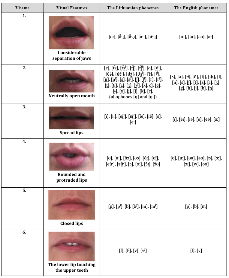 Therefore, as this study focuses on dubbing from English to Lithuanian, a suitable system of visemes, in this case, is provided by Indrė Koverienė in her dissertation Dubbing as an Audiovisual Translation Mode: English and Lithuanian Phonemic Inventories in the Context of Visual Phonetics (2015). All phonemes of both languages are distributed to a particular group according to similarities in visible aspects of their pronunciation. The six visemes are presented in Table 2.