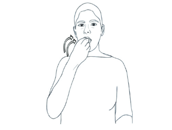 Ikoniškumas reiškia, kad konkreti simbolinė plaštakos forma <...> atvaizduoja daiktą ar jį simbolizuo- jantį veiksmą13“ (Valli, Lucas 2002: 5). Kitaip tariant, GK gestai dažnai yra motyvuoti (skirtingai nei žodžiai žodinėse kalbose – pastarosioms kalboms būdingas arbitralumas). Šią ypatybę gestotyrininkai įvardija kaip ypač svarbią, nes ikoniškumas „atveria kitokias galimybes nei kad garsinė (angl. aural) / žodinė (angl. oral) raiška“ (Müller ir Cienki, 2009). Ikoniškumą GK, analizuodami GK metaforas – ypač kognityviniu požiūriu – Wilcox ir kolegos (2000) apibrėžia ne kaip gesto ir žodžio santykį, o kaip dviejų konceptualių erdvių tarpusavio ryšį. GK metaforų tyrėjos Wilcox (2000) ir Taub (2001) dau- giausia dėmesio savo tyrimuose skyrė ikoniškumo ir metaforų GK tarpusavio sąsajoms. Minėtos ty- rėjos atskleidžia, kaip skirtingos gesto fonemų klasės14 gali ikoniškai reprezentuoti kai kuriuos gesto reikšmės komponentus, dalis, o tada jas galima metaforiškai susieti su abstrakčia sąvoka, konceptu iš kito semantinio lauko (Meir, Cohen 2015: 2). Gestotyrininkai Irit Meir ir Ariel Cohen (2015), iliustruo- dami ikoniškumo ir metaforų sąsajas, pateikia Izraelio gestų kalbos gestų VALGYTI15 ir MOKYTIS pavyzdį. Pastebėtina, kad minėtas gestas VALGYTI LGK yra toks pats, tačiau gesto MOKYTIS loka- lizacija skiriasi (žr. 1 ir 2 pav.).