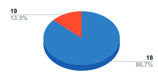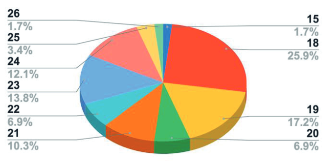 As Figures 1 and 2 show, the groups were different in terms of their age. While most of the EFL students (86.7%) were 18, the remainder were 19 years old; in the English L1 group, 18 and 19 year-olds comprised less than half (43.1%) of the respondents.