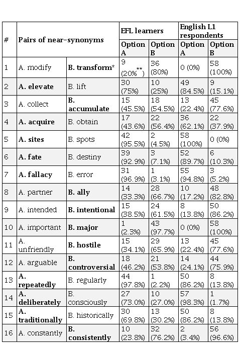 Similarly to EFL students, the L1 group demonstrated strong lexical preferences for sites, fallacy, and major in the 5th, 7th and 10th items, respectively. Additionally, English L1 speakers had nearly a unanimous preference for transform in the 1st item with 100% of respondents choosing it; in the 14th item, 56 (96.6%) of the participants chose deliberately as opposed to only 73.0% of EFL students; and in the last item 56 (96.6%), L1 speakers chose consistently as opposed to only 76.2% in the EFL group.