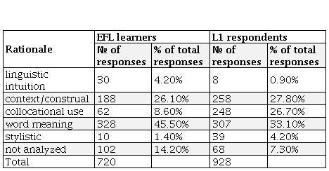 As far as for choice justification (summarized in Table 3), clear differences between explanations of EFL learners and L1 speakers can be observed. First of all, 4.2% of EFL learners referred to their intuition when explaining lexical choices. Meanwhile, less than 1% of responses given by L1 speakers fall under this category. Quite the opposite can be said about the stylistic category. While 4.2% of L1 speakers’ justifications referred to stylistic features of sentences, only slightly over 1% of answers given by EFL learners mentioned it. What is more interesting is that the rest of the responses given by L1 speakers are fairly equally distributed among the remaining three categories: context/construal (≈28%), collocational use (≈27%), and word meaning (≈33%). The distribution patterns of EFL learners’ answers associated with these categories, however, differ. A strikingly low percentage of answers (less than 9%) referred to collocational use of target near-synonyms. Moreover, nearly half of all answers given by EFL learners (45.5%) belong to the word meaning category. The number of responses belonging to the context/construal category was, on the other hand, fairly the same: 26.1% of total responses given by EFL learners and 27.8% of English L1 speakers’ answers. The responses that were incomplete or missing are reflected in the “not analyzed” section of Table 3.