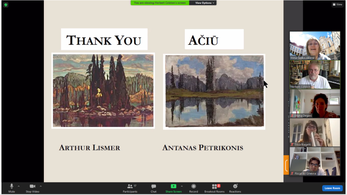 Kitas žinomas mokslininkas, profesorius Herbertas Colstonas iš Albertos universiteto (Kanada), baigdamas savo pranešimą vienoje sekcijoje dėkojo klausytojams ir rengėjams vaizdu, kurį sukomponavo iš įdomios medžiagos. Paskutinėje savo pranešimo skaidrėje jis parodė dviejų dailininkų darbus – vienas iš jų buvo Kanados, o kitas – Lietuvos. Jam leidus, žemiau pateikiu ekrano fotografiją: