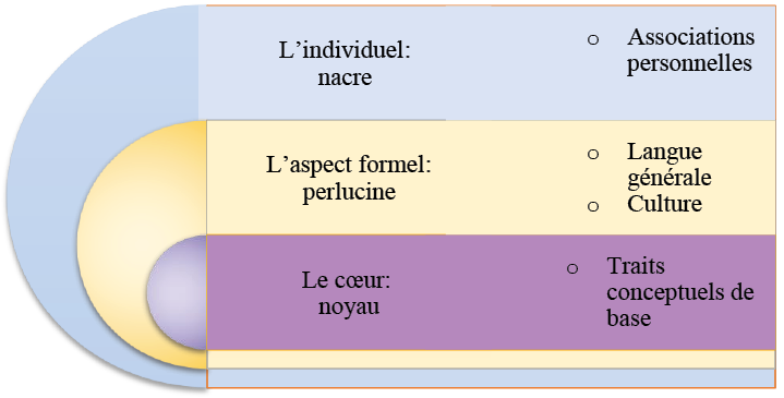 Pour résumer, au cœur de notre structure qui ressemble à une perle, on retrouvera les traits conceptuels de base qu’on avait pu préciser en produisant une définition du terme basée sur le contexte. Ce niveau est celui du mental où vivent les concepts.
