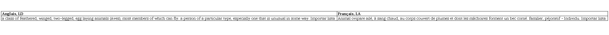 Prenons un exemple : le terme « bird » est traduit par « oiseau » en français. En ostéopathie biodynamique, il signifie « système ventriculaire, en particulier le troisième ventricule, et sa fonction immunitaire ». Le mot est clairement emprunté à la langue générale. Le dictionnaire (Antidote) nous fournit les significations suivantes pour l’anglais et le français (tableau 2):