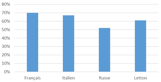 On a pu observer une résonance similaire dans 70 % des cas pour les termes en français, 67 % pour les termes en italien, 61 % en letton et 52 % en russe.