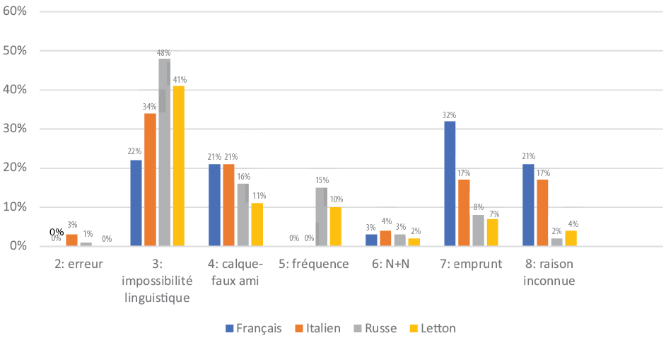 On voit que les résultats ne sont pas identiques : l’impossibilité linguistique est la raison la plus répandue pour le russe (qui paraît en ‘souffrir’ le plus), le letton et l’italien. Pour le français, c’est l’emprunt qui occupe la première position. Les calques-faux amis et les raisons inconnues sont assez fréquents en français et en italien, tandis que les difficultés de fréquence concernent surtout le russe et le letton.
