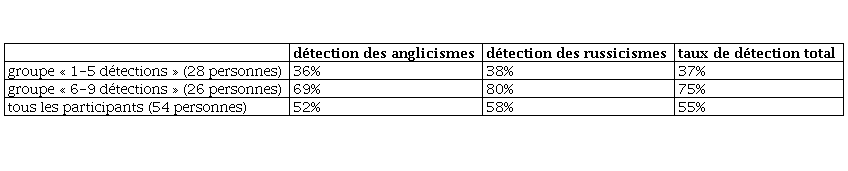 Le graphique suivant représente les taux de détection pour les items contrôlés appartenant aux groupes de « faux anglicismes » et de « faux russicismes ».