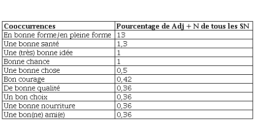 Ce tableau présente les SN qui correspondent statistiquement à ce que nous considérons comme des cas représentatifs de ce corpus. En général, l’adjectif bon est utilisé, dans la plupart du temps pour intensifier respectivement les qualités, les attitudes positives du nom. L’omission possible de bon ne change pas le sens principal, mais la préférence des apprenants se manifeste par la fréquence répétitive de cet adjectif. L’emploi de l’adverbe bien au lieu de bon(ne)s est également fréquent, ex. :