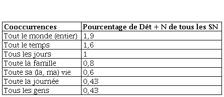 Le tableau 2 illustre la fréquence de la construction tout le monde, qui est plutôt figement que collocation. Les collocations telles que toute la famille, tout le temps sont à la frontière du figement. Le reste n’a pas de traits particuliers. En dehors des cooccurrences mentionnées, quelques constructions singulières se distinguent, dont la liste est exposée dans le tableau 3.