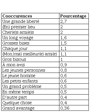 Le tableau ci-dessus représente une liste des cooccurrences qui ne sont ni diverses et ni nombreuses. Certains cas (tableaux 1–3) listés comme collocation semblent figés : bonne chance, bon courage, tout le monde, toute la journée, en premier lieu, grosses bises, à mon avis, en même temps, d’autre part, quelque chose, grand avantage. Même si ces syntagmes sont stables, nous considérons certains d’entre eux comme des collocations, notamment bonne chance, toute la journée, grand avantage où soit l’adjectif soit le déterminant conserve son rôle de modificateur et accepte la gradation. A l’inverse, chaque jour, en même temps sont plutôt considérés comme figements. « C’est bien la relation stable entre l’expression linguistique X et l’élément de la réalité X qui impose le figement et non les caractéristiques particulières de l’adjectif » (Goes 2018 : 599). Selon Mejri, « l’action du figement ne se limite pas au lexique ; elle englobe également la grammaticalisation par le biais de laquelle la langue se dote des outils syntaxiques permettant de structurer le discours » (Mejri 2005 : 164). De cette manière, tout le monde, quelque chose correspondent à des concepts préexistant dans la langue et ne sont en conséquence pas considérés comme collocations.
