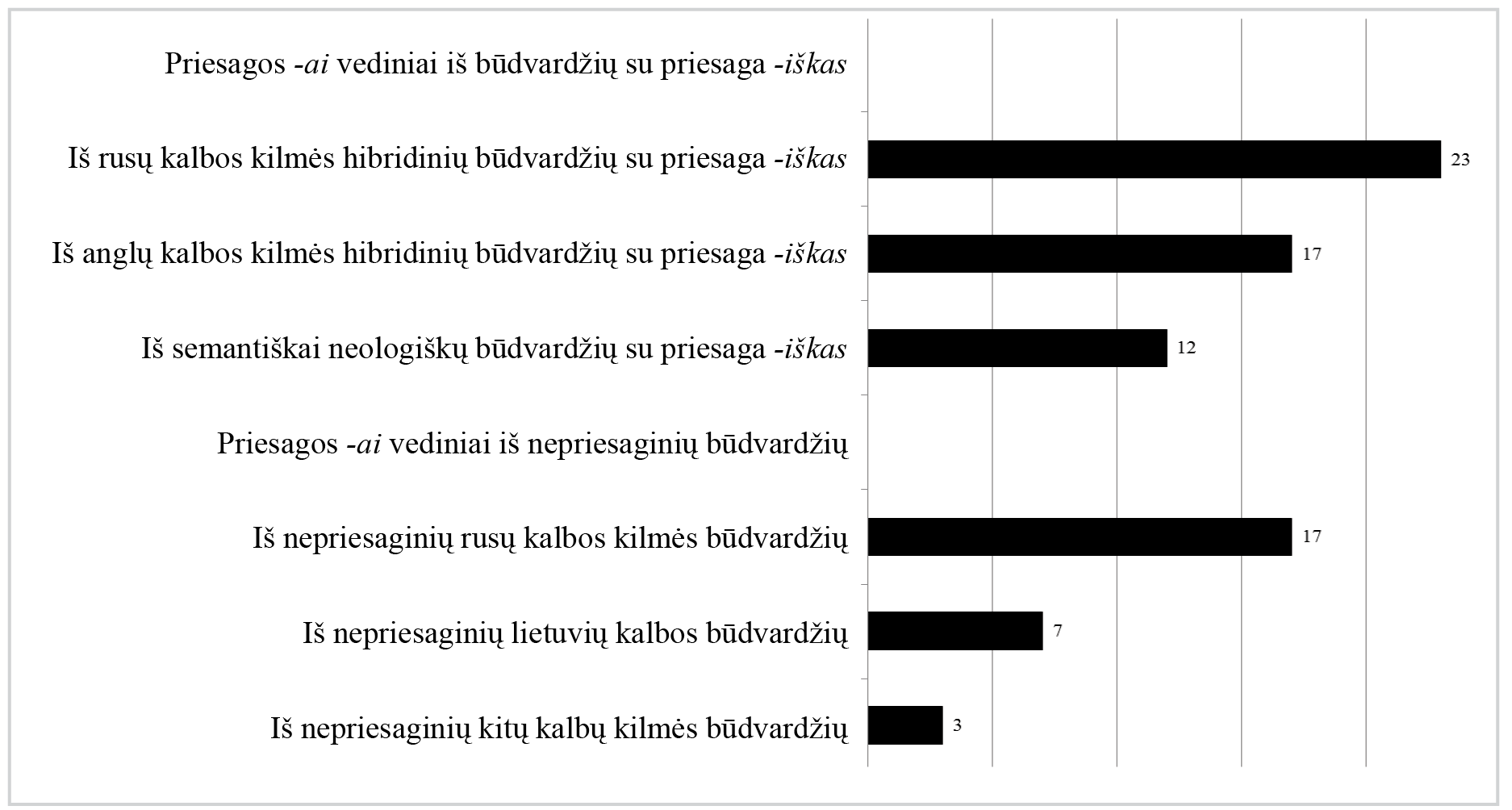 Žargone yra nemažai priesagos -ai vedinių, kurių pamatiniai žodžiai yra hibridiniai būdvardžiai su priesaga -iškas, bk ši priesaga priklauso dariausioms būdvardžių priesagoms (Keinys 1999: 76; LKE 1999: 111). Bk būdingiausia -iškas priesagos būdvardžių darybinė reikšmė – ‘panašus į pamatiniu žodžiu pasakytą daiktą’: vaiduokliškas šešėlis, niekšiškas žmogus. Šie būdvardžiai taip pat žymi esmines daikto ypatybes: automatiškas judesys, dvasiškas gyvenimas, logiškas samprotavimas (kai kuriais atvejais galimi sinonimai priesagai -inis. šventiška / šventinė nuotaika, logiška / loginė išvada) (DLKG 2005: 207). Priesagos -inis vedinių sinonimika nėra naujas dalykas, nors sinchroniškai priesagos -inis vediniai yra išskiriamųjų būdvardžių darybinės kategorijos, o priesagos -iškas – panašios bei būdingos ypatybės, tačiau praeityje šių darybos tipų semantiniai ryšiai buvo daug artimesni, plg. pavyzdžius: dievingas ‘dieviškas’, draugingas ‘draugiškas’ (Ambrazas 2003: 17–20). Lietuvių kalbos žargone būdvardžiai su priesaga -iškas daromi irgi iš daiktavardžių, kaip ir bk. Hibridinių būdvardžių pamatiniai žodžiai gali būti tiek rusų, tiek anglų kalbos. Prieveiksmiai su priesaga -ai gali būti padaromi iš kiekvieno tokio hibridinio būdvardžio. Žargone prieveiksmiai perima būdvardinę pamatinių žodžių semantiką – priesaga -iškas nurodo išorinį (pagal pavidalą, formą) ar vidinį panašumą, nors gali žymėti ir esminę ypatybę.
