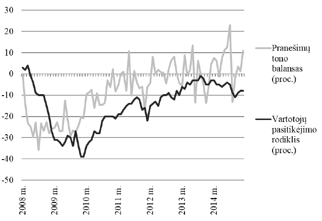 Glaudžiausias pranešimų tono balanso rodiklio ryšys užfiksuotas su vartotojų pasitikėjimo indeksu (žr. 9 pav.). Teigiama priklausomybė užfiksuota per visą tyrimo laikotarpį (koreliacijos koeficientas 0,48). 2009 m. sausio – 2014 m. gruodžio mėn. laikotarpiu koreliacijos koeficientas yra net 0,75. Žemiausią tašką abu rodikliai pasiekė 18 mėnesių atstumu – t. y. vartotojų pasitikėjimo rodiklis į pranešimų tono balanso pokyčius reagavo lėčiau negu pramonės produkcijos, tačiau greičiau negu mažmeninės prekybos apyvartos indeksas. Vis dėlto atkreiptinas dėmesys, jog iš 9 paveikslo matyti, kad vartotojų pasitikėjimo rodiklis smuko gerokai ilgiau – dvejus metus, nuo 2008 m. pradžios iki žemiausio taško 2009 m. lapkričio–gruodžio mėn. – negu pranešimų tono balansas (smuko pusę metų nuo 2008 m. pradžios iki liepos mėn., po to stabilizavosi ir įgavo kylančią tendenciją). Nuo 2008 m. sausio mėn. iki lapkričio mėn. vartotojų pasitikėjimo rodiklis buvo didesnis negu pranešimų tono balansas, tačiau nuo 2008 m. gruodžio mėn. iki pat tyrimo laikotarpio pabaigos, įsigalėjus pesimistinėms gyventojų nuotaikoms, vartotojų pasitikėjimo rodiklis visą laiką išliko žemesnis negu pranešimų tono balansas (su retomis išimtimis 2013 m. ir 2014 m.); ypač didelis atotrūkis pastebimas 2010–2011 m. Tai reiškia, kad vartotojų nuomonė išliko pesimistinė, nors žiniasklaidos pateikiamas situacijos atspindys tuo laikotarpiu gerėjo.