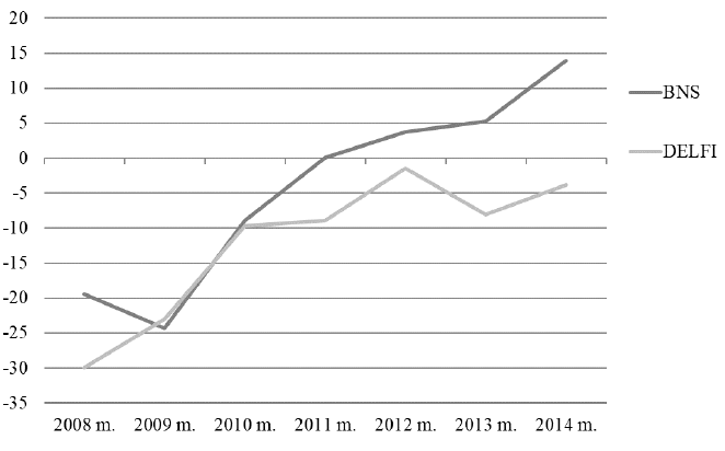 Palyginus pranešimų tono balanso reikšmes pagal žiniasklaidos priemonę (žr. 10 pav.), matyti, kad abiejų šaltinių tendencijos ne visuomet buvo tapačios. DELFI pranešimų balanso tonas buvo blogiausias 2008 m. ir po to gerėjo iki 2012 m., 2013 m. pablogėjo ir 2014 m. vėl pagerėjo, tačiau iki žemesnio negu 2012 m. lygio. Atkreiptinas dėmesys, jog 2012–2014 m. DELFI pranešimų tono balansas ženkliai nebedidėjo ir buvo neigiamas, nors ekonomikos padėtis gerėjo. BNS pranešimų tono balansas 2009 m., palyginti su 2008 m., tapo labiau neigiamas ir atitiko ekonomikos nuosmukio tendenciją tais metais. Po to, nuo 2009 m. iki pat 2014 m., BNS pranešimų balansas nuolat gerėjo ir nuo 2012 m. išliko teigiamas.