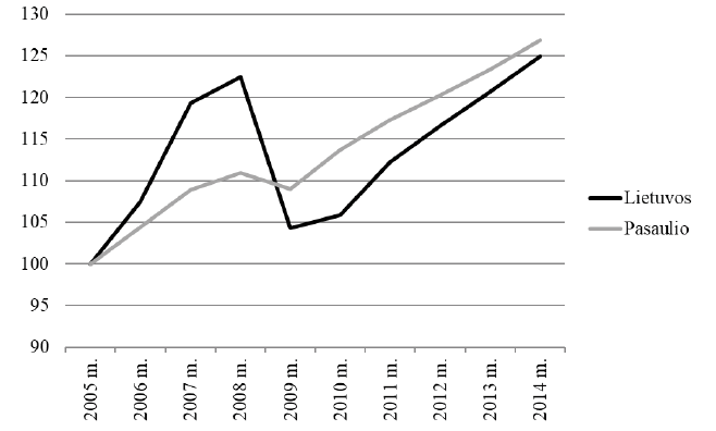 2008–2009 m. pasaulio ekonomiką ištikusios krizės poveikis Lietuvai buvo labai didelio masto. Kaip matyti iš 1 paveiksle pateiktų kreivių, Lietuvos realusis BVP, pagrindinis ekonomikos padėties matmuo, 2009 m. smuko daug labiau negu atitinkamas viso pasaulio rodiklis. Pastebėtina, kad 2009 m. Lietuvos ekonomikos apimtis smuko iki 2006 m. lygio, taigi per krizę buvo prarastas visas 2007–2008 m. ekonomikos prieaugis. Vis dėlto 2014 m. Lietuvos realiojo BVP indeksas jau viršijo 2006 m. pasiektą ankstesnę viršūnę, todėl galima konstatuoti, kad 2014 m. šalies ekonomikos mastu krizės laikotarpis jau buvo pasibaigęs. Kita vertus, ekonominiai gyventojų gerovės rodikliai – realusis darbo užmokestis, nedarbas – buvo blogesni negu prieš krizę, tad galima konstatuoti, kad gyventojams krizės pasekmės dar buvo aktualios ir 2014 metais. Atkreiptinas dėmesys, kad Lietuvos ekonomika smuko tik vienerius metus 2009 m. (žr. 1 pav.), o 2010 m. jau pradėjo augti – nors ekonomikos nuosmukis buvo labai gilus, tačiau trumpalaikis. Atliekant šio straipsnio tyrimą, pastebėta, kad nuo 2011 m. rugpjūčio iki 2012 m. rugpjūčio BNS žinutėse ir DELFI pranešimuose buvo kalbama apie „antrąją krizės bangą“, tačiau, kaip matyti iš 1 paveikslo, ji neįvyko – po 2009 m. nuosmukio, Lietuvos ekonomika iki 2014 m. nė karto nebepatyrė nuosmukio.