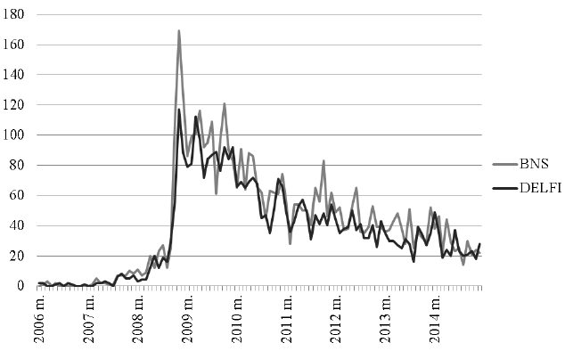 Kaip matyti iš 2 paveikslo, 2006–2014 m. BNS ir DELFI mėnesinio pranešimų kiekio kitimas buvo labai panašus, išskyrus tai, kad BNS žinučių skaičius beveik nuolat buvo šiek tiek didesnis negu DELFI pranešimų kiekis. Nuo 2006 m. sausio iki 2007 m. liepos mėn. imtinai pranešimų su raktiniais žodžiais „-kriz-„ ir „sunkme-“ beveik nebuvo (nuo 0 iki 5 per mėnesį). 2007 m. rugpjūčio mėn., kai pasirodė pirmieji rimtesni pasaulio finansų krizės požymiai, pranešimų skaičius ėmė pamažu augti ir iki 2008 m. rugsėjo mėn. sudarė nuo 4 iki 29 per mėnesį. Pastebėtina, kad į profesionalius vartotojus orientuota BNS agentūra daugiau minėti krizę pradėjo jau 2007 m. lapkritį, o DELFI žinučių skaičius neviršijo dešimties per mėnesį iki 2008 m. balandžio mėn. Daugiausiai apie krizę ir sunkmetį abu šaltiniai rašė 2008 m. spalio – 2009 m. gruodžio mėn. (žr. 2 pav.), išsyk po JAV investicinio banko „Lehman Brothers“ bankroto, kuomet pasaulinė finansų krizė prasidėjo visu smarkumu, o Lietuvos vyriausybė aktyviai ėmėsi veiksmų krizei įveikti: didino mokesčius, mažino socialines išmokas ir pan. (žr. priedo 1 lentelę). Šiuo laikotarpiu BNS žinučių skaičius svyravo nuo 61 iki 169, o DELFI – nuo 56 iki 117 per mėnesį. Pastebėtina, kad BNS žinučių pagausėjo anksčiau ir didesne apimtimi negu DELFI pranešimų.
