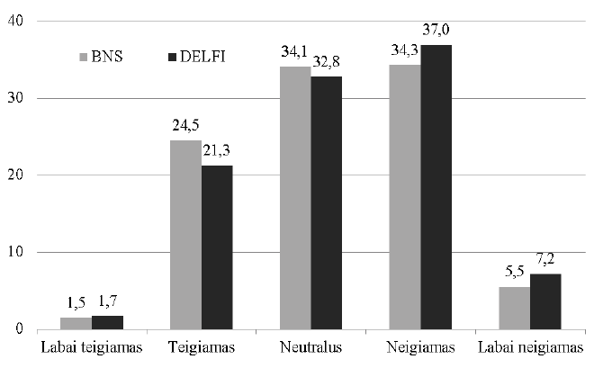 Atlikus pranešimų tono pagal žiniasklaidos priemonę analizę, užfiksuota vidutinio stiprumo arba stipri statistiškai reikšminga (p=0,001) koreliacija (koreliacijos koeficientas yra 0,70 arba didesnis) tarp BNS ir DELFI pranešimų tono laiko eilučių, tik labai teigiamo tono pranešimų atveju sąsaja nėra glaudi (koreliacijos koeficientas lygus 0,38). Proporcingai daugiau neigiamų žinių, kaip ir tikėtasi dėl auditorijos ir žanro skirtumų, pateikė į plačiąją visuomenę orientuotas DELFI interneto portalas negu BNS naujienų agentūra (žr. 4 pav.). Pirmajame šaltinyje 37,0 proc. visų pranešimų buvo neigiamo tono, antrajame – 34,3 proc. visų pranešimų; labai neigiamų – atitinkamai 7,2 proc. ir 5,5 proc. Nors proporcijų skirtumas nežymus, tačiau įdomu pastebėti, kad kito kraštutinio tono – labai teigiamo – taip pat daugiau pateikė interneto portalas DELFI (1,7 proc.) negu BNS (1,5 proc. visų pranešimų). Šios dvi nustatytos tendencijos rodo, kad interneto portalas DELFI, orientuotas į plačiąją visuomenę, galėjo turėti didesnį polinkį akcentuoti neigiamas naujienas, ir tokiu būdu, kaip rašo moksliniai autoriai, siekti patraukti didesnį dėmesį ir išlaikyti didesnį skaitomumą negu profesionalius vartotojus informuojanti BNS agentūra. Didesnį kraštutinių tonų – labai neigiamo ir labai teigiamo – pranešimų skaičių DELFI šaltinyje lėmė ir stiliaus ypatumai: aktyvesnis sustiprinančių modalinių žodžių ir vaizdingų teigiamai ar neigiamai konotuotų žodžių vartojimas negu iš esmės dalykinę informaciją perteikiančios BNS agentūros žinutėse.