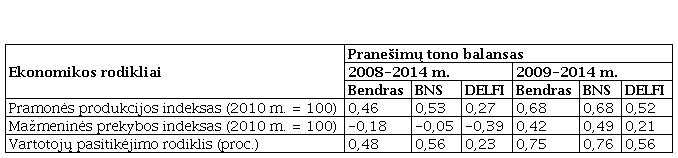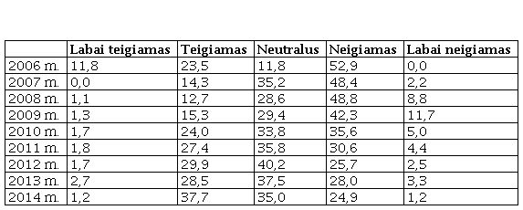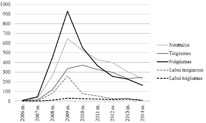 Tiriamuoju laikotarpiu neigiamo ir teigiamo tono žinučių skaičiaus tendencijos buvo priešingos (žr. 2 lentelę). Labai teigiamo ir teigiamo tono pranešimų nuosekliai gausėjo nuo 13,8 proc. visų pranešimų 2008 m. iki 38,9 proc. 2014 m. Ir atvirkščiai, blogiausios ekonomikos padėties laikotarpiu, 2008–2009 m., daugiau negu pusė (55,8 proc.) visų žinučių buvo labai neigiamos ir neigiamos, o 2014 m. jų dalis jau buvo sumenkusi daugiau negu dvigubai ir sudarė 26,1 proc. Neutralaus tono pranešimų dalis 2008–2014 m. buvo santykinai pastovi ir sudarė 30–40 proc.