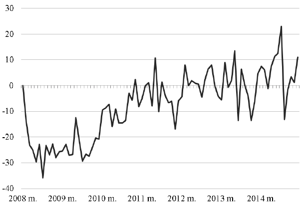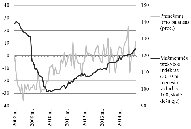 Gyventojų vartojimo apimtį atspindinčio mažmeninės prekybos apyvartos indekso ir pranešimų tono balanso ryšys per visą tyrimo laikotarpį pasižymėjo prieštaringomis tendencijomis (žr. 8 pav.) – koreliacijos koeficientas lygus –0,18. Vis dėlto, kaip ir pramonės produkcijos atveju, galima nustatyti šio ryšio lūžio momentą. Nuo 2008 m. sausio mėn. iki liepos mėn. blogėjo ir pranešimų tono balansas, ir mažmeninės prekybos apyvarta (koreliacijos koeficientas per šį laikotarpį yra 0,65). Neigiamą koreliacijos koeficientą per visą laikotarpį iš esmės lemia viena periodo atkarpa: priešinga rodiklių judėjimo kryptis nuo 2008 m. rugpjūčio mėn. iki 2010 m. vasario mėn. (koreliacijos koeficientas yra –0,28). Kaip matyti iš 8 paveikslo, tuo metu mažmeninės prekybos indeksas staigiai ir smarkiai mažėjo, o pranešimų tono balansas palengva gerėjo. Žemiausią tašką pranešimų tono balansas pasiekė 2008 m. liepos mėn., o mažmeninės prekybos apyvartos indeksas – 2010 m. vasario mėn., t. y. 20 mėnesių vėliau. Stiprus tos pačios krypties ryšys užfiksuotas 2010 m. kovo – 2011 m. gegužės mėn. (koreliacijos koeficientas yra 0,73), kuomet abiejų rodiklių reikšmės didėjo. Nuo 2011 m. birželio mėn. iki 2014 m. gruodžio mėn. mažmeninės prekybos apyvartos indeksas kilo, o pranešimų tono balansas tokios aiškios didėjimo tendencijos neįgavo, tad ir statistiškai reikšmingo tarpusavio ryšio konstatuoti negalima (koreliacijos koeficientas šiuo laikotarpiu yra 0,34, o vien 2014 m. vėl sumažėja iki 0,00).