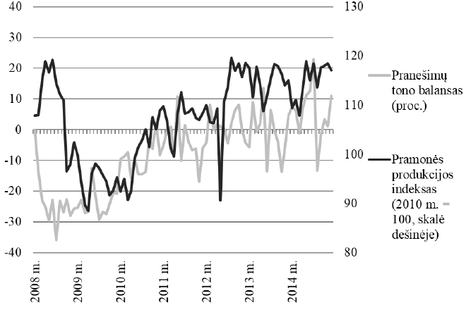 Kaip matyti iš 7 paveikslo, pranešimų tono balanso rodiklis, palyginti su pramonės produkcijos indeksu, pradėjo mažėti anksčiau: pirmasis rodiklis blogėjo nuo pat 2008 m. pradžios, o pramonės produkcijos indeksas – nuo 2008 m. birželio mėn. Be to, pranešimų tono balansas pasiekė žemiausią reikšmę 2008 m. liepos mėn., o pramonės produkcijos – 2009 m. balandžio mėn. (skirtumas – 9 mėnesiai), po to abiejų rodiklių reikšmės įgavo ilgalaikę kylančią trajektoriją.