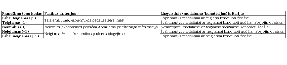 Šiame tyrime, remiantis Nijkrake, Gosselto ir Guttelingo pranešimų skirstymu pagal toną, pranešimai pagal toną suskirstyti į penkias kategorijas: labai teigiamus (suteikiant kodą 2), teigiamus (1), neutralius (0), neigiamus (-1) ir labai neigiamus (-2) (Nijkrake, Gosselt, Gutteling 2015: 83). Pranešimo tono nustatymui pasitelkti du kriterijai – faktinis ir modalumo, apibendrinti 1 lentelėje. Pagal pirmąjį kriterijų buvo nustatoma, kokių pasekmių gyventojams ar įmonėms (auditorijai, bet ne, pavyzdžiui, valstybei ar politikams) – teigiamų ar neigiamų – turės pranešime aprašomas įvykis ar ekonominės padėties pokyčiai, arba identifikuojama, kokia ekonomikos, įmonės ir pan. padėtis aprašoma pranešime (gera ar bloga) (remiantis Soroka 2006: 375; Sheafer 2007: 28; Ju 2008: 241; Eshbaugh-Soha 2010: 128; Ju 2014: 448; Hetsroni et al. 2014: 188). Antrasis kriterijus – pranešime vartojami modaliniai žodžiai ir frazės ar jų nebuvimas, veiksmažodžių konotacija (kaip Nijkrake, Gosselt, Gutteling 2015: 83). Nustatant pranešimo toną, išsyk vertintas abiejų kriterijų atitikimas. Pasirinktas vienas iš Eisenmann ir autorių kolektyvo minimų pranešimo tono nustatymo būdų, vertinant visą pranešimą kaip vieną vienetą, o ne atskiras jo dalis (Eisenmann et al. 2012: 8; taip pat, kaip Nijkrake, Gosselt, Gutteling 2015: 83).