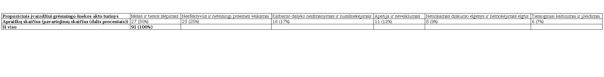 Sugrupavus įvaizdžiui grėsmingus šnekos aktus pagal jų propozicinį turinį išskirtos kelios grupės, pavaizduotos 1 lentelėje.