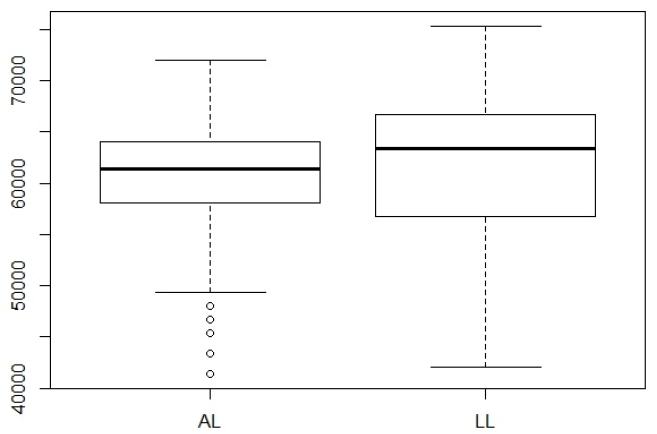 Rezultatai rodo, kad AL grupėje didžiausias žodynas yra 72 036, o mažiausias – 41 354 žodžiai, tad skirtumas tarp didžiausio ir mažiausio žodynų yra nemažas, t. y. 30 682 žodžiai. Žodyno vidurkis apie 60 300, mediana – 61 364 lemos. O LL grupės mediana yra gerokai didesnė (63 365). Tai rodo, kad iš esmės daugumos LL grupės respondentų žodynas yra didesnis nei Airijoje gyvenančių asmenų. Tai atsispindi ir lentelėje – visi nurodyti rezultatai LL grupėje yra aukštesni: didžiausias žodynas yra 75 371 lema, mažiausias – 42 021, o vidurkis – apie 62 100. Žvelgiant į 1 paveikslą matyti, kad LL žodyno ribos yra platesnės negu AL grupės, skirtumas tarp mažiausio ir didžiausio žodyno yra apie 33 400 žodžių. Patikrinus grupių žodyno vidurkių skirtumą T testu, paaiškėjo, kad jis yra statistiškai reikšmingas (. = 0,048), tai reiškia, kad AL žodynas yra statistiškai reikšmingai mažesnis nei LL žodynas.