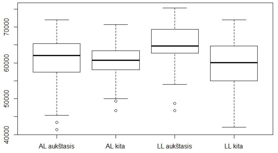 2 paveiksle pateikiamas AL ir LL grupių sugretinimas pagal išsilavinimą. Kaip matyti, AL grupėje didesnį žodyną yra sukaupę aukštąjį universitetinį išsilavinimą įgiję asmenys, tačiau skirtumas nėra didelis. Aukštojo universitetinio išsilavinimo respondentų žodyno dydžio vidurkis yra apie 60 400 žodžių (mediana – 62 031), o žemesnį išsilavinimą įgijusių asmenų – apie 60 300 žodžių (mediana – 60 697). T testo duomenimis, toks skirtumas yra statistiškai nereikšmingas (. = 0,972), tad galima teigti, kad išsilavinimas aptartu požiūriu AL žodyno dydžiui įtakos neturi. Vis dėlto, reikia prisiminti, kad dalis AL respondentų išvykę iš Lietuvos studijavo ir Airijoje. Tikėtina, kad studijos Airijoje turėjo įtakos ir jų lietuvių K1 žodynui, tačiau tam patikrinti reikėtų išsamesnių tyrimų. LL grupėje situacija kitokia – žodyno dydis stipriai skiriasi tarp skirtingo išsilavinimo asmenų: aukštąjį universitetinį išsilavinimą įgijusių respondentų žodyno vidurkis yra apie 64 800 žodžių (mediana – 64 700), žemesnį išsilavinimą įgijusių asmenų – apie 59 400 (mediana – 60 000). T testas parodė, kad skirtumas yra statistiškai reikšmingas (. = 0,000062), o tai reiškia, kad įgytas išsilavinimas LL grupėje turi įtakos žodyno dydžiui.
