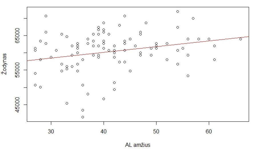 Vis dėlto amžius, kaip pavienis veiksnys, AL ir LL grupėse analizuotas išsamiau. Atliktas koreliacijos testas AL grupėje parodė, kad yra silpna teigiama koreliacija (R = 0,25) tarp respondentų amžiaus ir žodyno dydžio (3 pav.), koreliacija statistiškai reikšminga (. = 0,01). Taigi pasitvirtina teorija, kad žodynas auga kartu su amžiumi. Tačiau koreliacijos testas LL grupėje neparodė sąsajos tarp respondentų amžiaus ir žodyno dydžio. Toks rezultatas prieštarauja ankstesniems lietuvių žodyno dydžio tyrimams (Andriuškevičiūtė, Vilkienė 2019). Tad kyla klausimas, kodėl AL grupėje amžius yra reikšmingas kintamasis, o LL grupėje nereikšmingas.