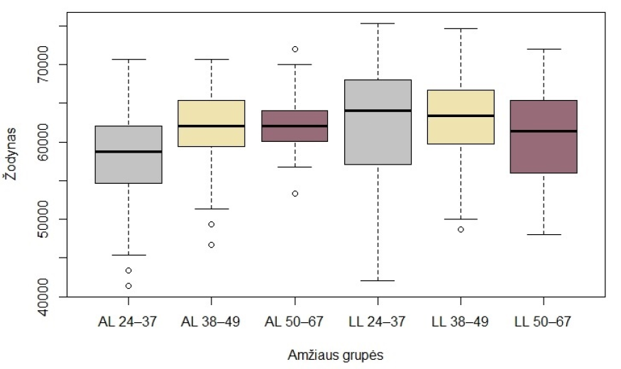 4 paveiksle pateikiamas AL ir LL amžiaus grupių sugretinimas. Žvelgiant į AL amžiaus grupes, matyti, kad jauniausių respondentų (24–37 m.) žodynas yra mažiausias (vidurkis – 57 700, mediana – 58 696), o vyresnės grupės (38–49 m.) gerokai didesnis (vidurkis – 61 700, mediana – 62 031). Tačiau vėliau žodynas nebeaugo – vyriausios grupės (50–67 m.) žodynas beveiks toks pat kaip ir jaunesnės: mediana tokia pati, bet vyriausių respondentų vidurkis yra šiek tiek aukštesnis nei jaunesnės grupės (atitinkamai apie 62 300 ir 61 700 žodžių). Tad ir amžiaus grupių palyginimas atspindi žodyno augimą su amžiumi, tą patvirtina ir Anova testas (. = 0,000248). Tačiau LL grupėje situacija priešinga – jauniausių respondentų žodynas yra didžiausias (vidurkis 62 500, mediana 64 032) ir vėliau palaipsniui mažėja: vidutinio amžiaus grupės vidurkis apie 62 400 žodžių, mediana – 63 365, o vyriausių respondentų žodynas mažiausias (vidurkis – 61 300, mediana – 61 364 žodžiai). Tačiau Anova testas rodo, kad šie skirtumai LL grupėje nėra statistiškai reikšmingi (. = 0,737). Lyginant AL ir LL, matyti, kad labiausiai skiriasi jauniausio amžiaus grupių žodynas: LL jauniausių respondentų žodyno vidurkis yra 4800 žodžių didesnis nei AL to paties amžiaus asmenų. Tačiau vyriausių asmenų žodynas AL grupėje šiek tiek didesnis nei LL, skirtumas – 1000 žodžių. Akivaizdu, kad amžius AL ir LL žodyną veikia skirtingai.