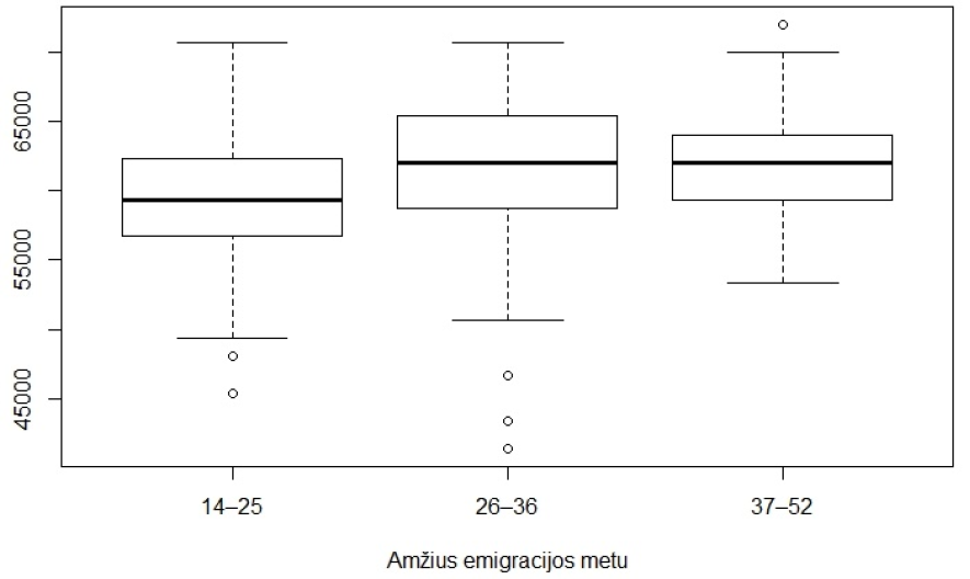 Išsiaiškinus, kad AL žodyno dydis koreliuoja su respondentų amžiumi per apklausą, buvo patikrinta, ar esama sąsajos ir su amžiumi emigruojant. Koreliacijos testas parodė silpną, bet statistiškai reikšmingą teigiamą koreliaciją (R = 0,27; . = 0,006), t. y. didesnį lietuvių kalbos žodyną sukaupė tie, kurie iš Lietuvos emigravo būdami vyresnio amžiaus. Tokį rezultatą galima nesunkiai nuspėti, nes logiška, kad ilgiau Lietuvoje gyvenę respondentai sukaupė didesnį K1 žodyną nei tie, kurie Lietuvoje gyveno trumpiau. Kita vertus, lyginant skirtingo AEM pogrupius (5 pav.) matyti, kad žodyno medianos skiriasi tik tarp pirmų dviejų pogrupių (14–25 m. ir 26–36 m.), atitinkamai 59 363 ir 62 031 žodis, o trečio pogrupio (37–52 m.) mediana yra tokia pati kaip antro pogrupio. Vis dėlto skirtumas tarp pirmų dviejų pogrupių nėra statistiškai reikšmingas. Neaišku, kodėl T testas nepatvirtina koreliacijos, bet tikėtina, kad tai būtų galima patikrinti atlikus išsamesnį tyrimą ir surinkus daugiau duomenų.