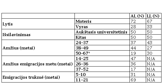 Tiriamąją grupę sudaro 100 Airijos lietuvių. Jų duomenys lyginami su 100 Lietuvoje gyvenančių lietuvių duomenimis. AL ir LL grupes buvo siekiama kiek įmanoma subalansuoti lyties, išsilavinimo ir respondentų amžiaus aspektais. Pirmoje lentelėje matyti abiejų grupių sugretinimas, o toliau grupių charakteristika aptarta atskirai.