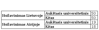 Pagal išsilavinimą, įgytą Lietuvoje, dalyviai suskirstyti į dvi grupes: pirmoje grupėje – respondentai, turintys aukštąjį universitetinį išsilavinimą, o antroje – turintys kitą, ne universitetinį, išsilavinimą (aukštąjį, profesinį ar vidurinį). Abiejose grupėse yra po 50 respondentų. Svarbu prabrėžti, kad dalis respondentų (37 asmenys) mokėsi ar studijavo ne tik Lietuvoje, bet ir Airijoje (žr. 2 lentelę).