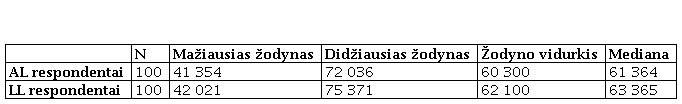 Žodyno dydžio testo rezultatai parodė, kad AL žodynas yra mažesnis už LL žodyną ir šis skirtumas yra statistiškai reikšmingas. Išanalizavus gautus rezultatus, galima daryti tokias išvadas: