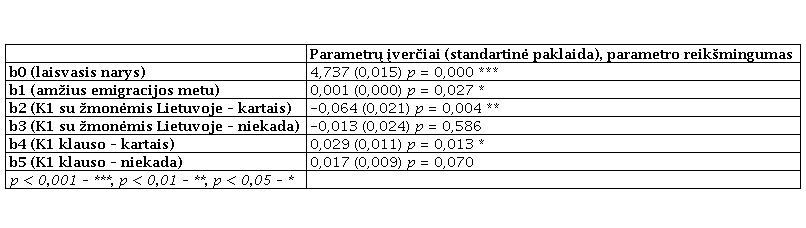 Rezultatai parodė, kad didžioji dalis tirtų kintamųjų neturi reikšmingos įtakos AL respondentų žodyno dydžiui. Reikšmingi kintamieji pateikti 4 lentelėje. Kaip matyti, vienas iš reikšmingų veiksnių yra respondentų amžius emigruojant. Tačiau šiuose modeliuose tiriamųjų amžius per apklausą nebėra reikšmingas veiksnys. Kiti reikšmingi veiksniai, kaip matyti lentelėje, yra bendravimas lietuviškai su žmonėmis Lietuvoje ir klausymo veikla (muzikos, garso knygų ar pan.). Rezultatai rodo, kad tų tiriamųjų, kurie lietuviškai su žmonėmis Lietuvoje bendrauja kartais, žodynas yra mažesnis nei tų, kurie bendrauja dažnai. Toks rezultatas lengvai paaiškinamas – dažnas K1 vartojimas, t. y. K1 aktyvinimas, neleidžia pasireikšti ar bent nutolina kalbos atriciją. Tačiau sunku paaiškinti, kodėl rezultatai rodo, kad lietuviškų garso įrašų klausymas kartais respondentų žodyną veikia geriau nei dažnas klausymas. Neatmestina, kad atsakymų variantus „dažnai“ ir „kartais“ respondentai vertina nevienodai, kas vienam atrodo „dažnai“, kitam gali būti „kartais“, todėl ir rezultatai sunkiai paaiškinami. Be to, tiek kalbant apie bendravimą su asmenimis Lietuvoje, tiek apie kalbinės klausymo veiklos rezultatus, reikia pasakyti, kad respondentų grupės pasiskirstė netolygiai. Taigi gautus duomenis reikėtų tikrinti išsamesniais tyrimais.